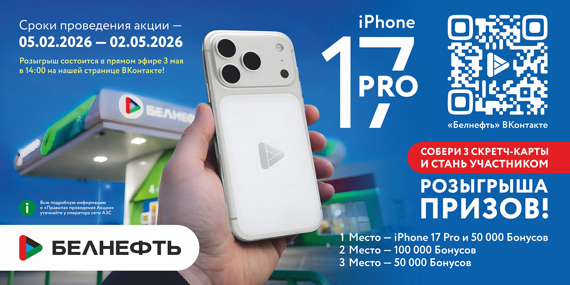 С 5 февраля по 2 мая заправляйтесь на станциях сети АЗС Белнефть в городе Старый Оскол, ул. Центральная 25 и село Незнамово 35, получайте скретч карты и выигрывайте гарантированные призы! Соберите 3 билета и станьте участником розыгрыша главного приза - 50 тысяч бонусов и iPhone 17 Pro!